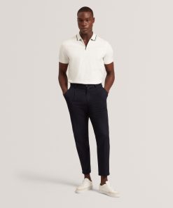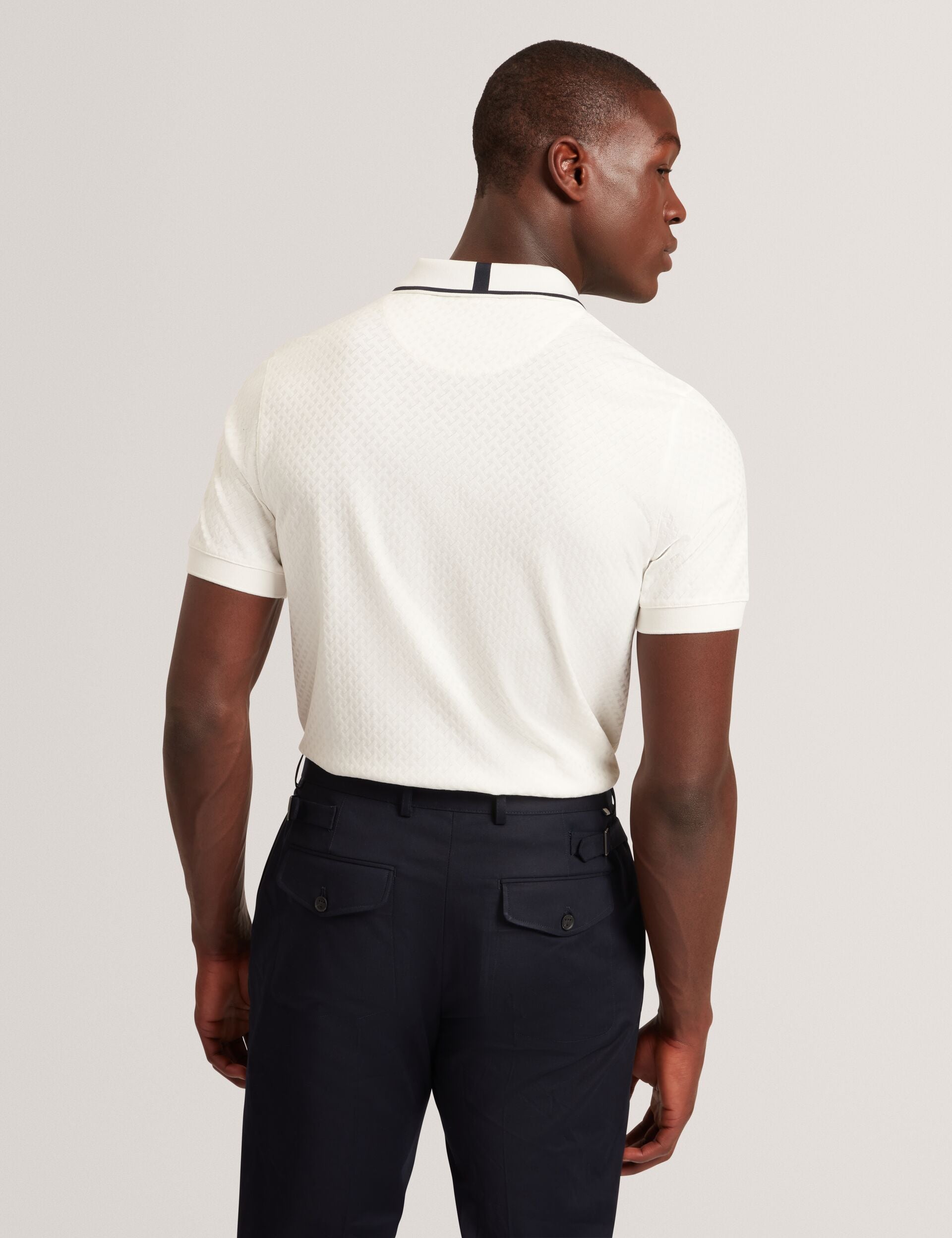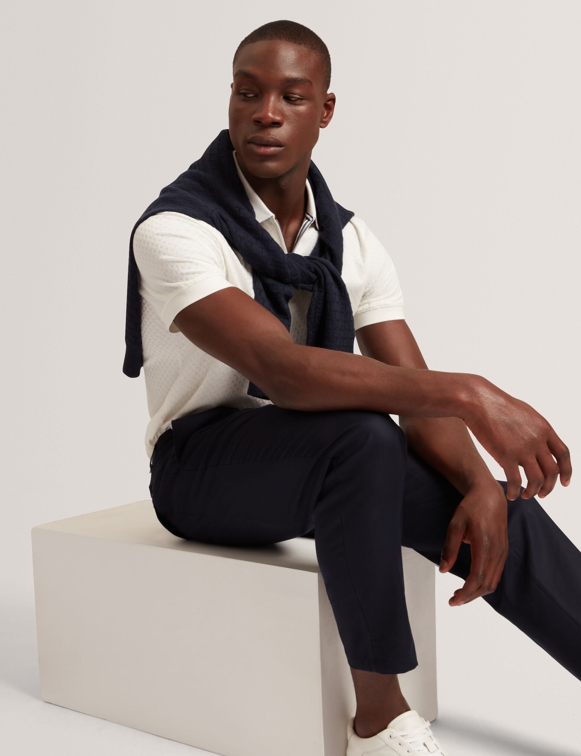 COPHEN makes a sharp addition to your polo collection. Our signature T texture gives it that designer twist, and we’ve trimmed the collar with a stand-out single stripe. Made from stretch cotton fabric, this piece is complete with a modern zip neck.