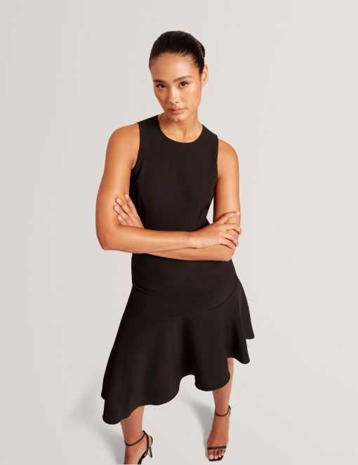 This dress offers a bold, modern twist on classic elegance, featuring an eye-catching asymmetric hem that creates a flattering, dynamic silhouette for a chic and sophisticated look.