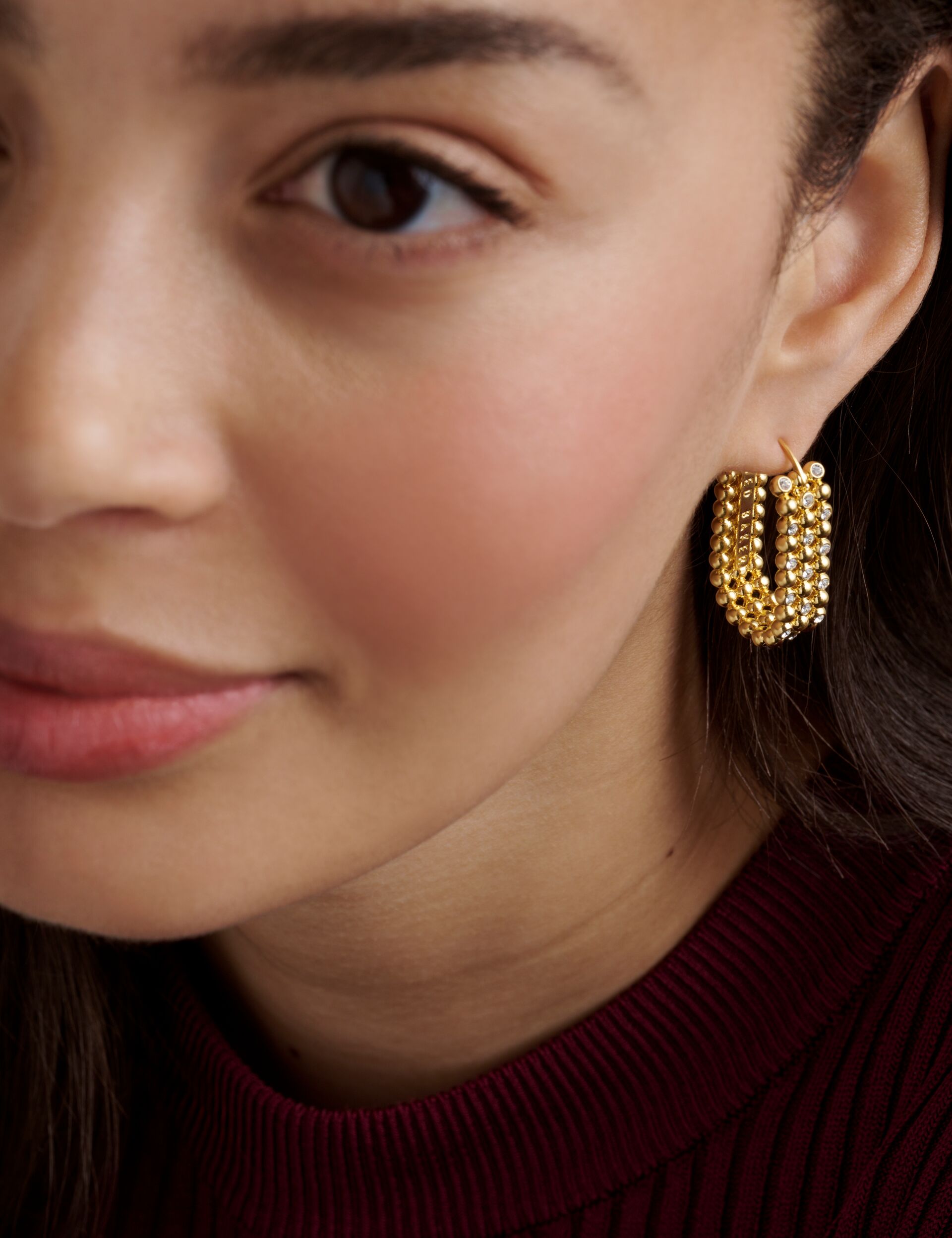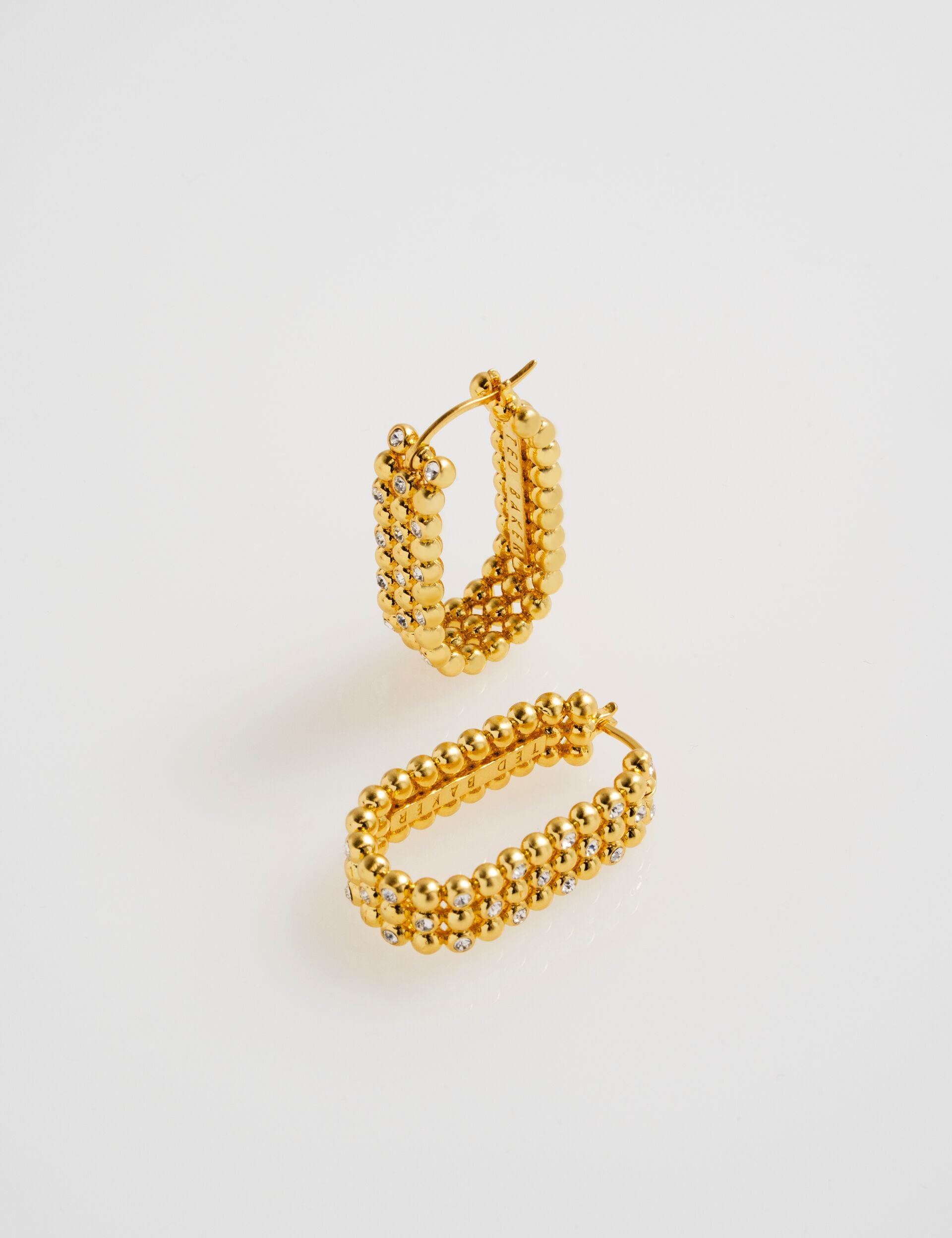 Bring a touch of texture to your jewellery collection with BOLLIE. These rectangular hoops feature rows of gold-tone beads interspersed with delicate crystal embellishments for a look that’s both modern and timeless.