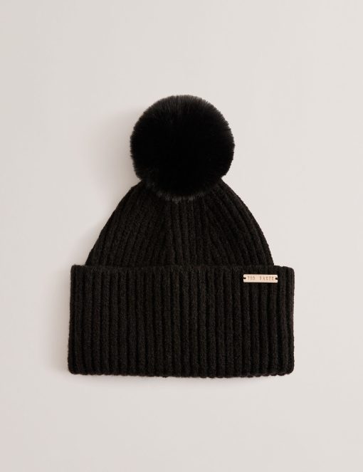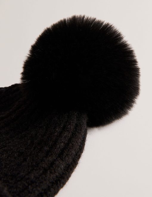 Ted Baker Women’s Emilyya – Ribbed Knit Fluffy Bobble Hat | Black