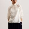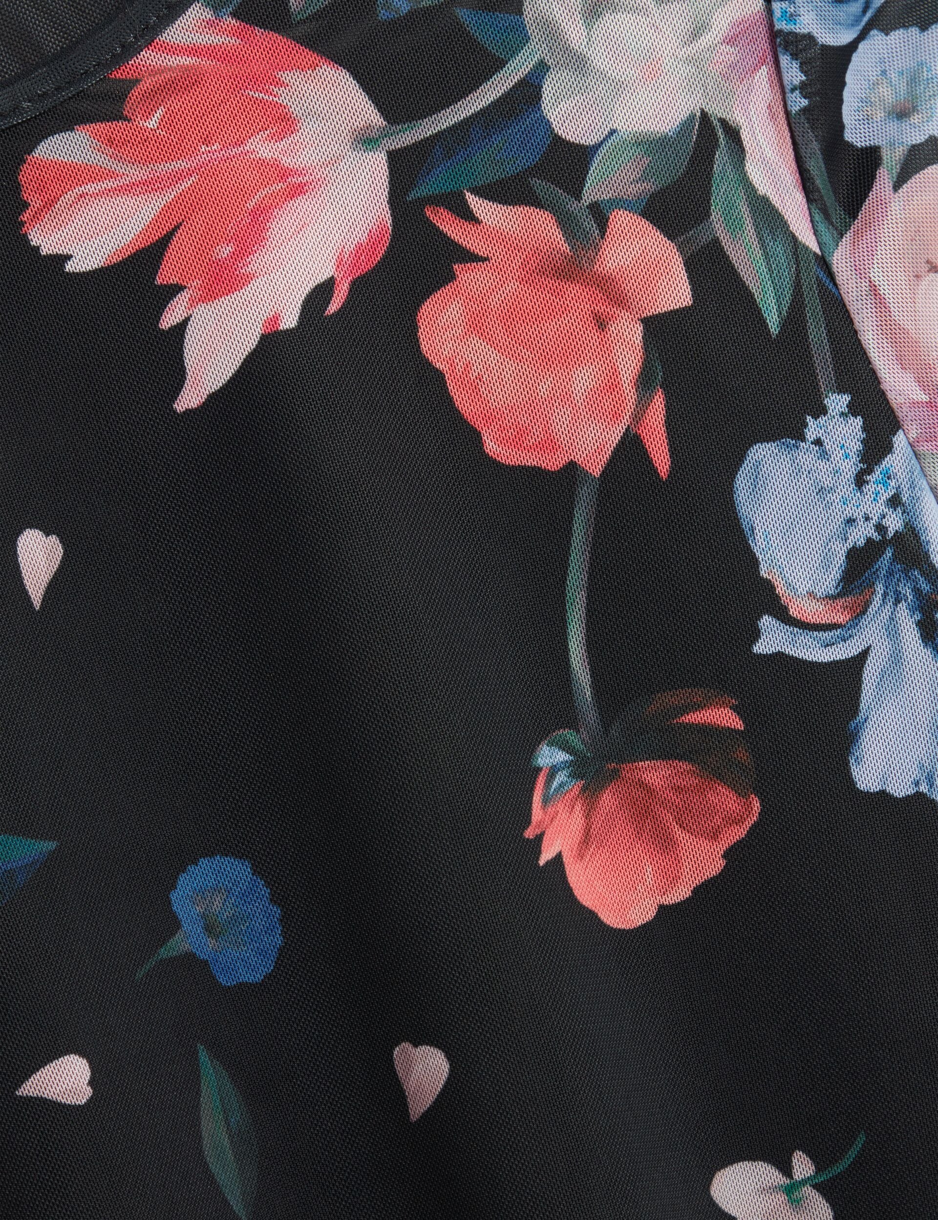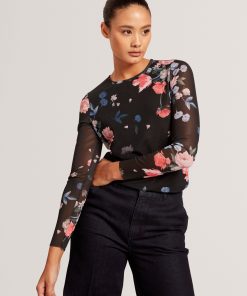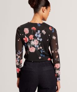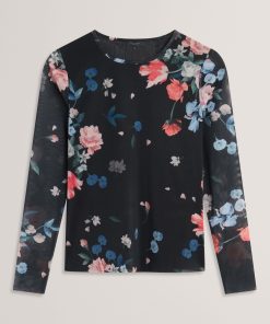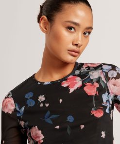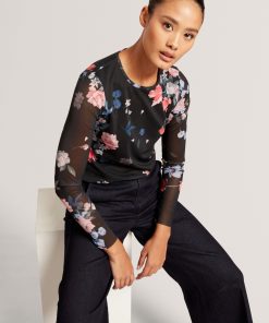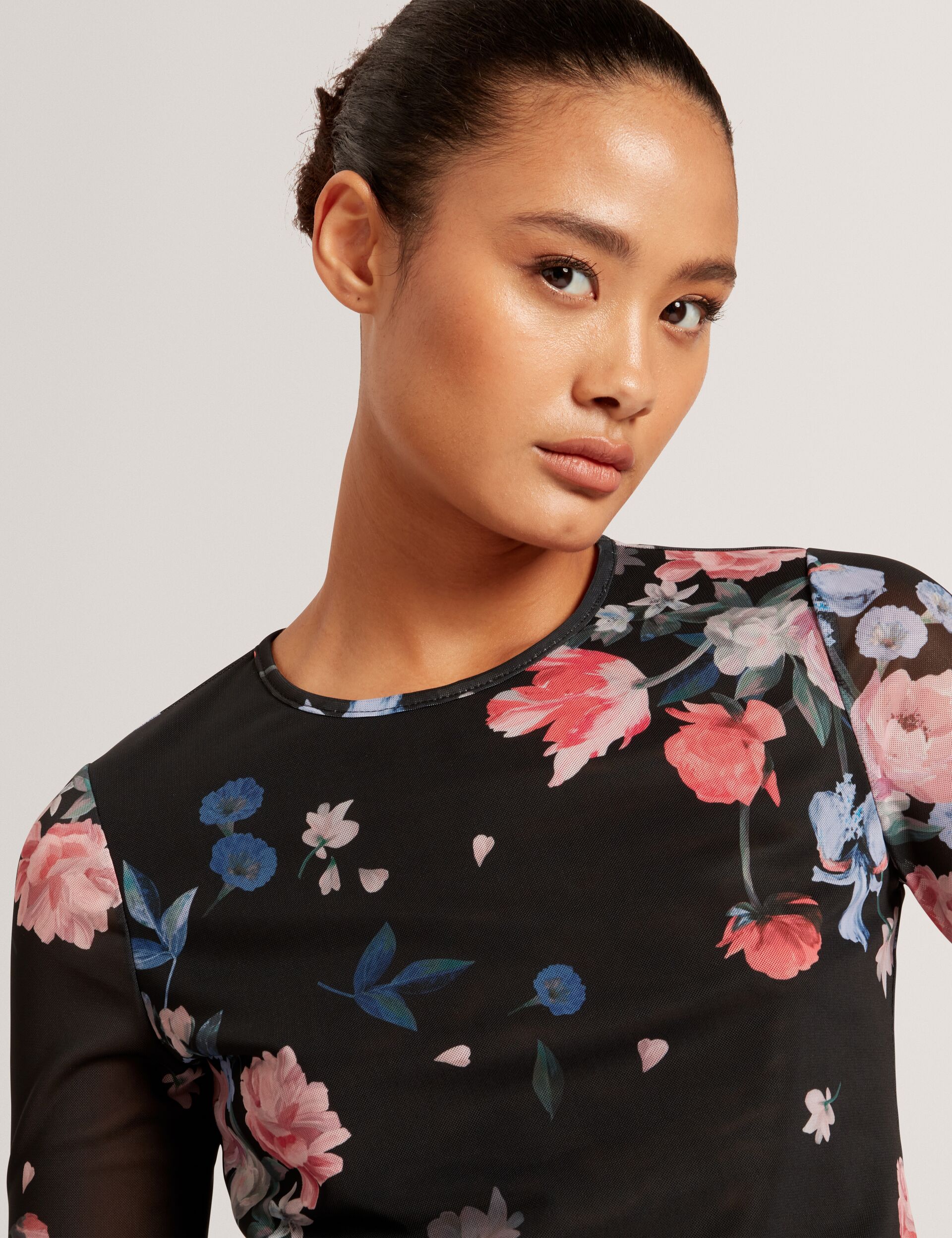 The Ted Baker London Long Sleeve Mesh Top features a vibrant floral design, combining delicate mesh fabric with an elegant, contemporary silhouette.