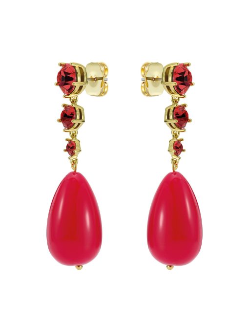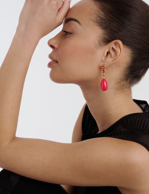 Accessorise to the nines with these PEARSTI statement earrings. A teardrop-shape pendant in vibrant pink is suspended from a row of matching colour crystals stones for the perfect balance of colour and sparkle.