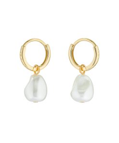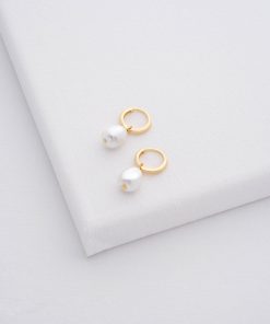 A simple pair of huggie hoops gets the elegant treatment with PERIAA, featuring a faux baroque pearl pendant for that classic touch. Finished with gold-tone plating and subtle engraved branding, these earrings are made with a hinge closure that’s secure and easy to use.