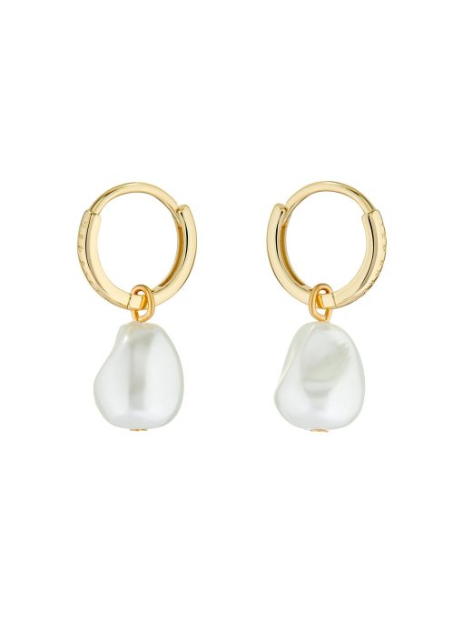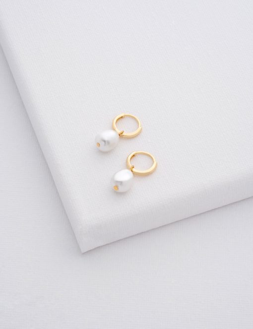 A simple pair of huggie hoops gets the elegant treatment with PERIAA, featuring a faux baroque pearl pendant for that classic touch. Finished with gold-tone plating and subtle engraved branding, these earrings are made with a hinge closure that’s secure and easy to use.